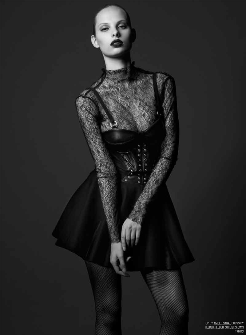 Dioni Tabbers is across between sex kitten and gothic lolita in monochramtic looks styled by Kumiko Yashiro and photographed by Masayuki Ichinose for Prim Magazine September issue. To see credits for the labels, click on each picture. Our favorite look is the lace top under the corset, edgy sexy but chic!